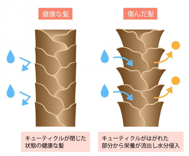 一方で、いわゆる「髪が傷んだ状態」とは、外部からの刺激によってキューティクルが剥がれたり、めくれたりして、中のタンパク質や脂質などの内部成分が外に漏れ出してしまっている状態を指します。内部成分が失われることで、髪はツヤを失うだけでなく、パサつきや広がりを感じやすくなり、切れ毛や枝毛にもつながります。